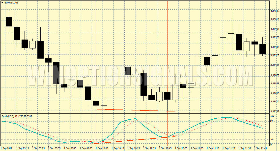 Очень важно понять принцип выявления дивергенции. Тогда трейдер сможет видеть ее даже без использования дополнительной разметки. На первых парах не стоит стесняться наносить разметку. Для отметки экстремумов используются обычные трендовые линии. Ниже будут представлены примеры, в которых мы определим дивергенцию, основываясь на показаниях Стохастика.