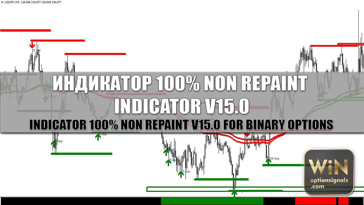 The 100% Non Repaint Indicator V15.0 is universal as it includes signals, levels and a trend panel. Green and red arrows indicate favorable conditions for buying Call and Put options. The trend bar below the chart displays the intersection of two moving averages, the color of which is also part of the trading signal.