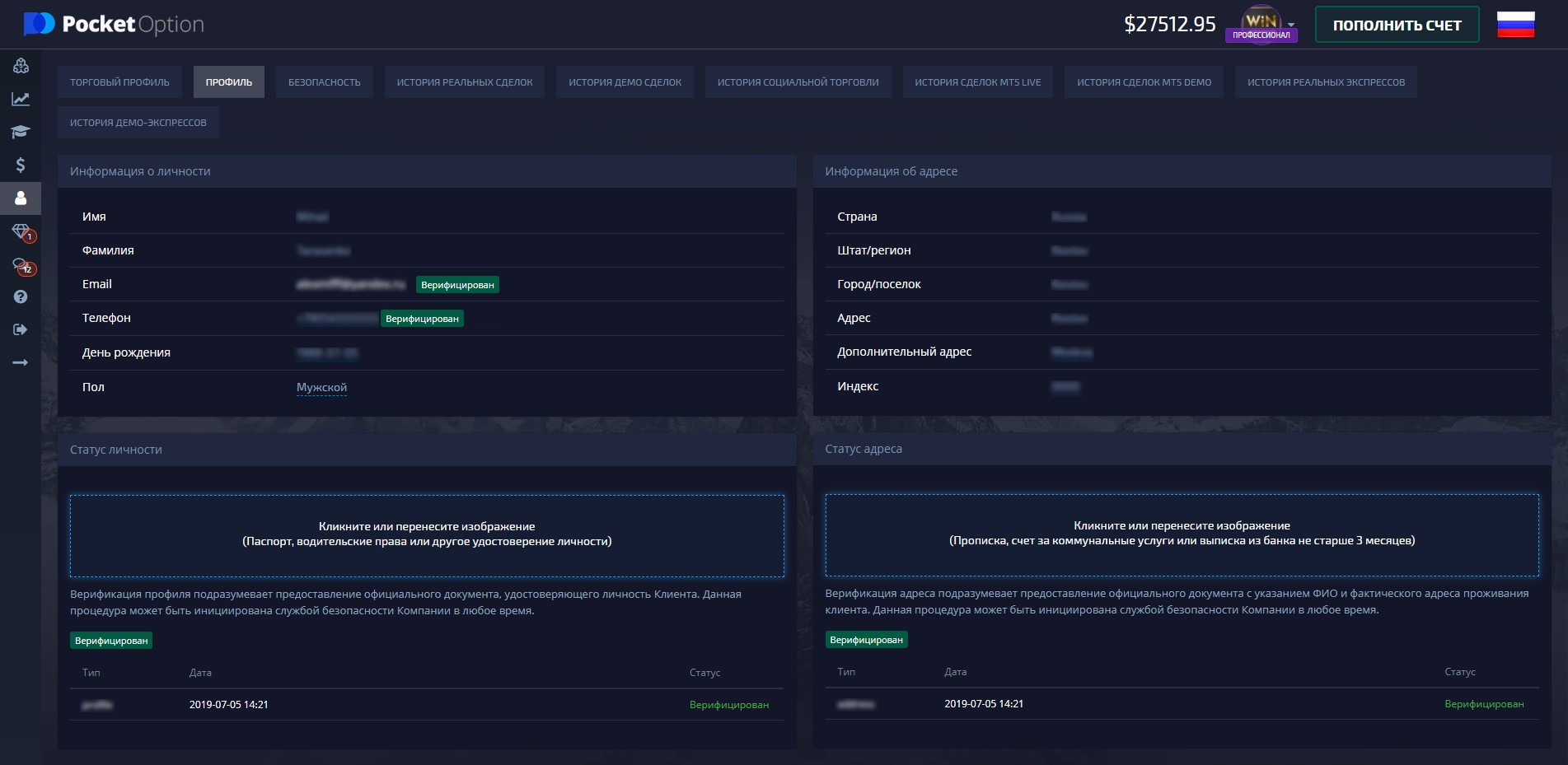To find out if identity verification was successful, you need to open the "Identification Status" and "Address Status" sections in your profile. This data verification is conducted based on scanned or photographed passport pages or other ID, driver's license. Once verification is complete, you'll see "Verified" status everywhere: