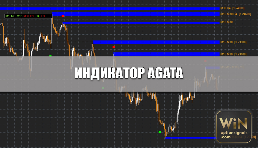 The AGATA binary options indicator is based on an algorithm that includes technical analysis, Dow theory, price action and some other types of analysis. Thanks to this amount of data taken into account, the indicator builds support and resistance levels, and generates signals when the price approaches these levels.