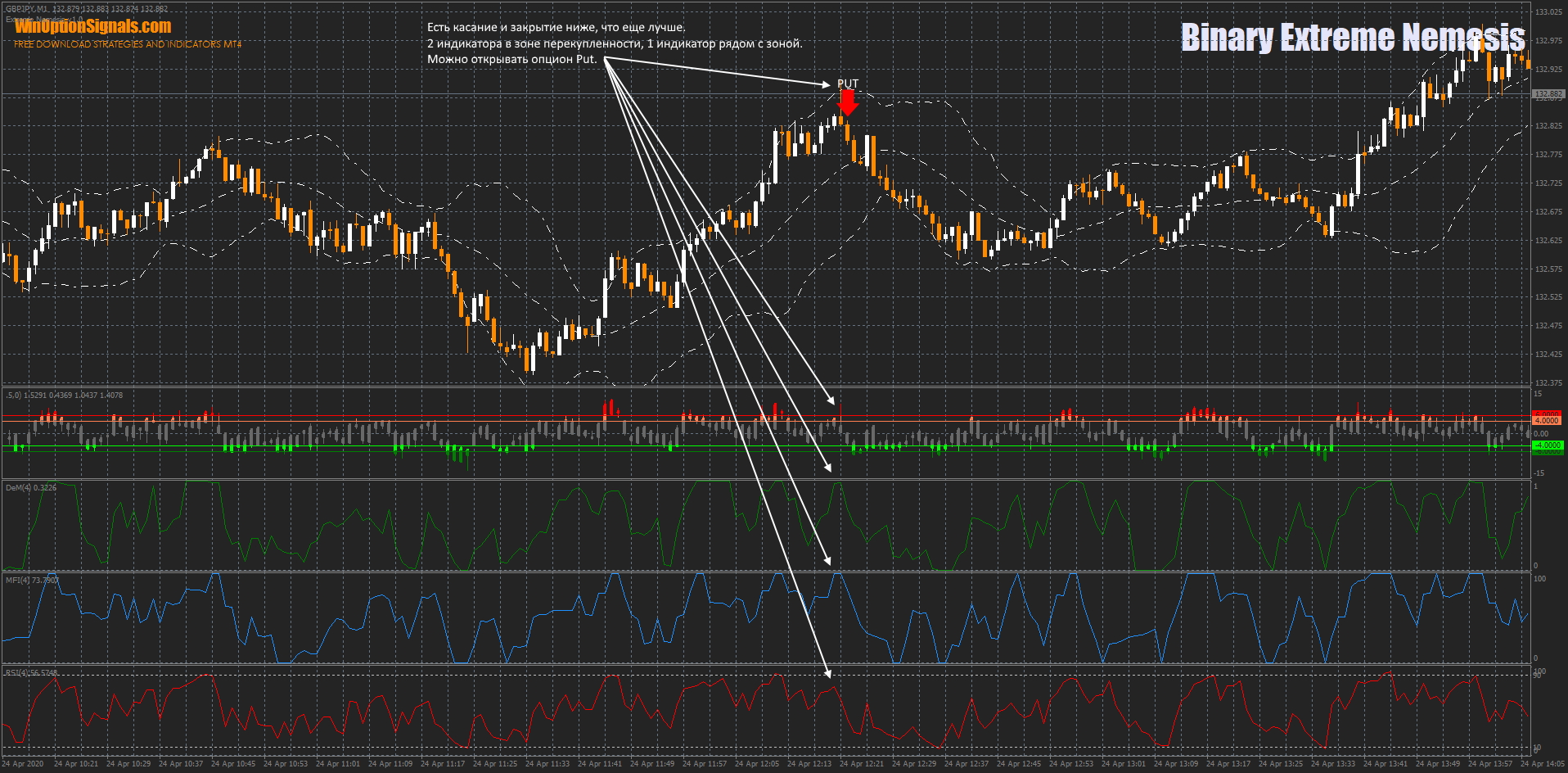 The binary options strategy Binary Extreme Nemesis seems complicated at first glance due to the abundant presence of indicators in it, but in reality it is not so. The rules of this strategy are simply simple and effective, and profits can be made almost immediately after using it, since the strategy is designed for transactions with expiration in one candle.