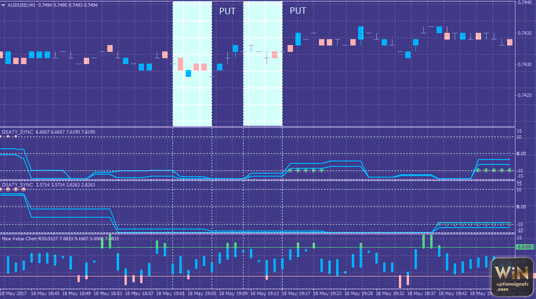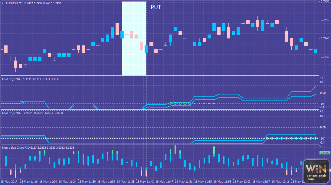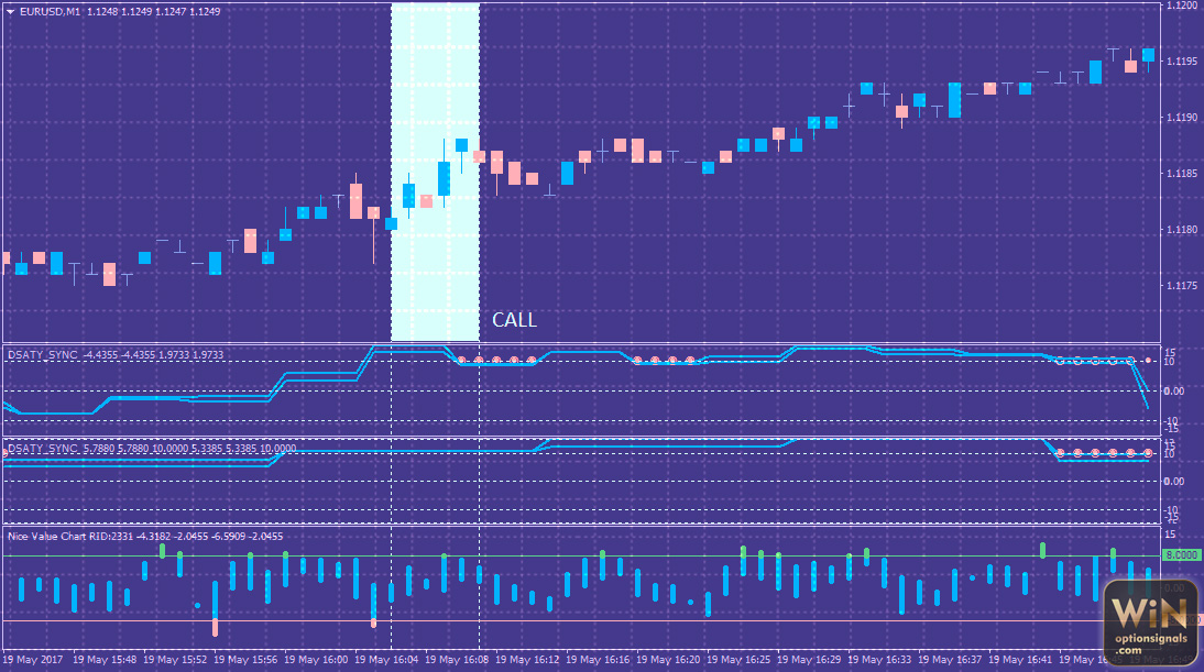 NYC works on a minute timeframe. Here we will look for the most profitable entry point. In other words, DSATY SYNC shows the main trend, and NYC determines the correction. An option is purchased on the next bar, a cut after the previous one closes in red.