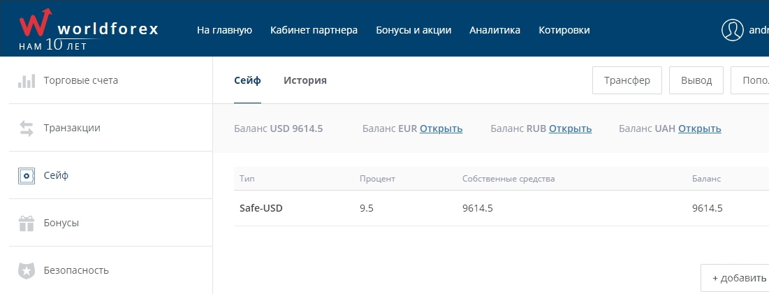 And here the Safe from the World Forex broker comes into play, which allows you to consistently, and most importantly, without risks, receive an income of 10% from the available funds stored in the Safe. For example, for an amount of $10,000 it will be possible to receive an annual profit of $1,000, and this is completely automatic. Those traders who consistently earn money from trading will, of course, say that this is very little. But those who have not yet managed to achieve a good and constant income should evaluate this opportunity, as it creates an additional “safety cushion”.
