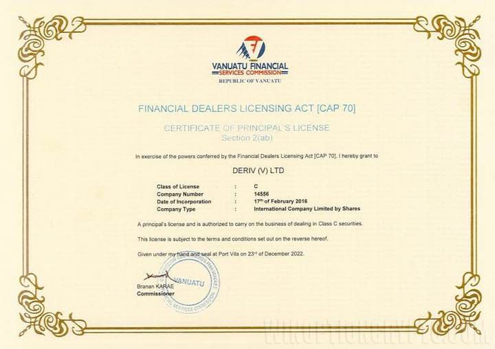 Deriv (V) Ltd (company number 014556) completed its registration in the Republic of Vanuatu on February 17, 2016. The legal address is 1276, Govant Building, Kumul Highway, Port Vila, Republic of Vanuatu.