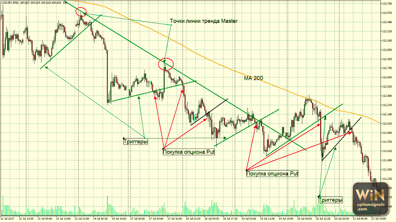 Also, instead of the “Master” line, MA200 (moving average with parameter 200) can be used. The process of adding it to the chart is much simpler than finding price lows and highs. The moving average (MA200) also indicates a change in trend, which allows it to be used as an additional filter. If the asset price is above the MA, then we take CALL; if below, we take PUT.