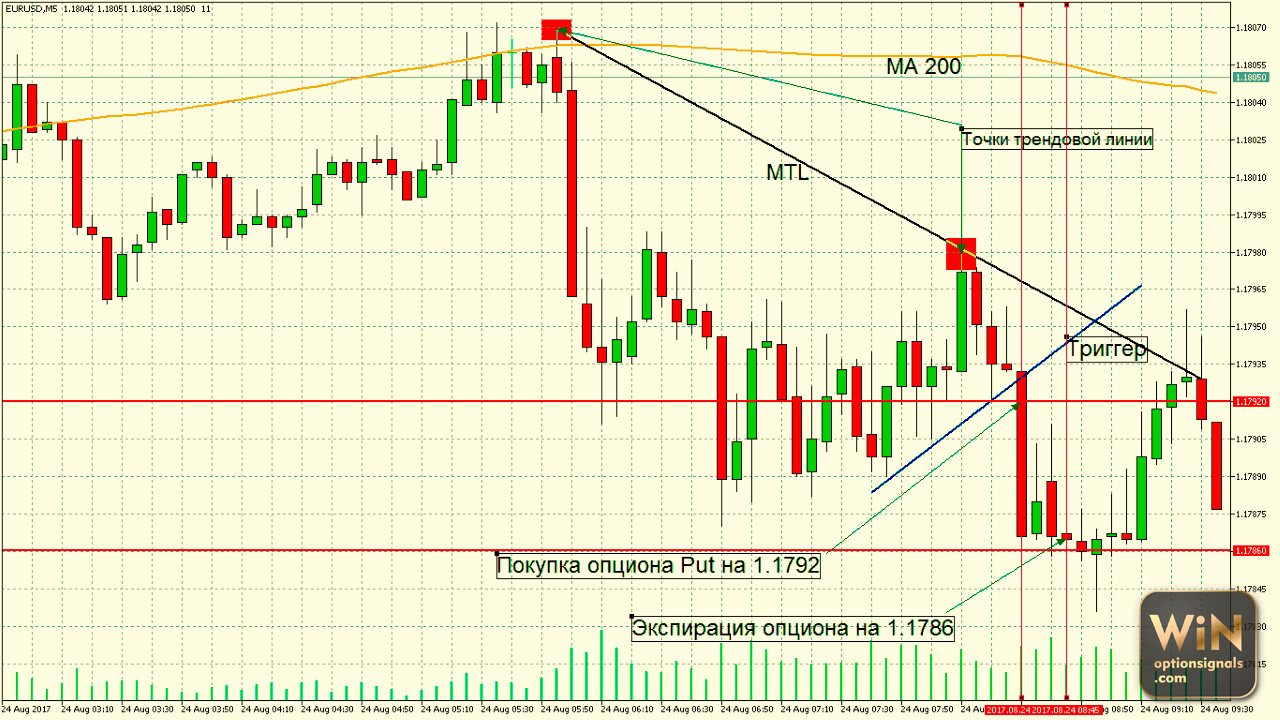 Let's consider a possible situation. For example, let's take the EURUSD chart with the M5 timeframe. Let's say the price is below MA200. As soon as a descending top appears on the chart, draw the “Master” line. Next you need to decide on the location of the “Trigger” line. It's 8.30 o'clock. The price breaks the trigger from top to bottom. Our action is to buy a put option at a price of 1.1792. We choose an expiration time of 15 minutes (3 candles). After this time we would have made a profit.