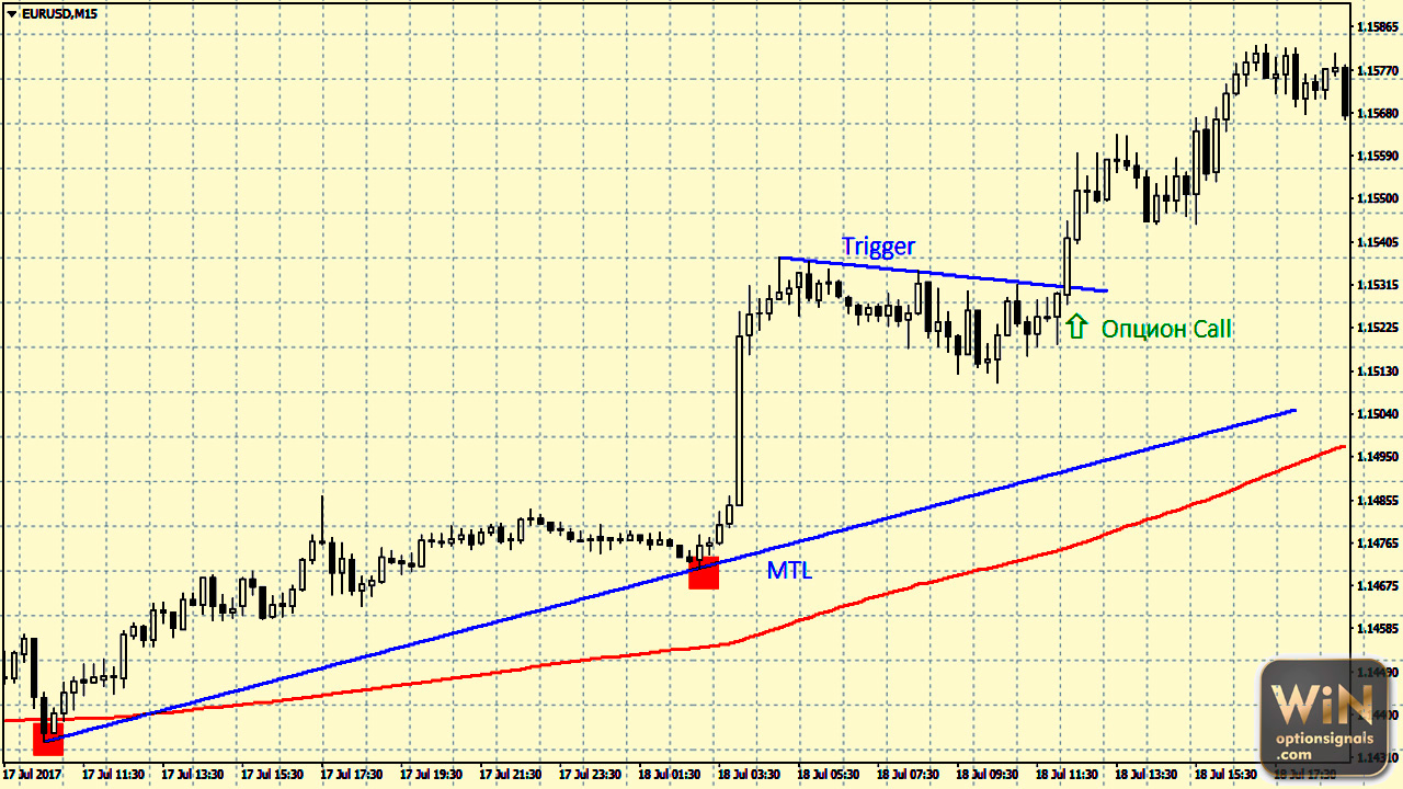 We do the same in a bullish trend. We draw the line “Master” and “Trigger”. After the breakout of the second one, we buy a call option (CALL).