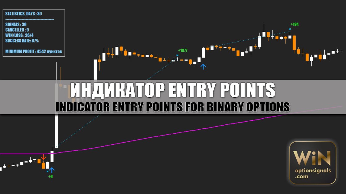 The Entry Points binary options indicator is a top technical analysis signal tool, specially developed for the MetaTrader 4 platform. According to the developers, it provides accurate signals for opening and closing trades without redrawing, keeps statistics of its signals, and is also suitable for trading any financial instruments.