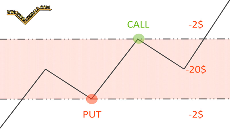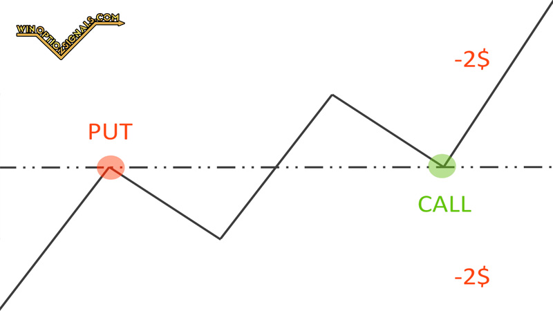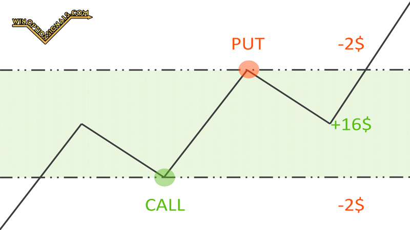 Based on the signal from the trading strategy, we open a Call position. The trend is favorable, the price rises and reaches the upper line of the corridor. The investor must in this case open a new deal, now in the opposite direction. The bet size and expiration time are the same as for the first option. Now the trader will not lose money in any development of events: the contracts will either reach the breakeven zone or close with a profit.