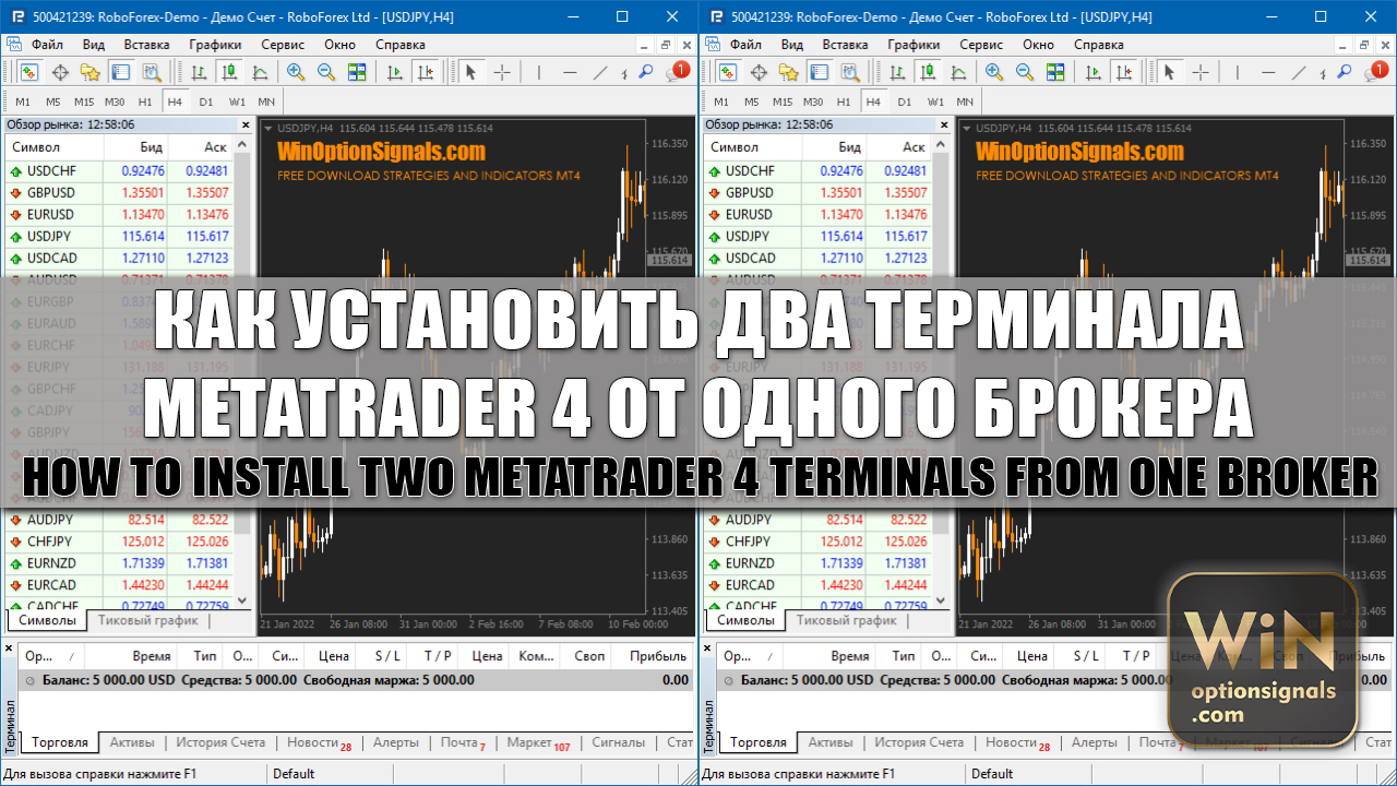 As their deposit increases and they gain experience in binary options trading, traders may begin to use multiple monitors. In such cases, you may need to install two MT4 terminals from one broker. This is very convenient when simultaneous trading is carried out on several assets or you need to track one asset on several timeframes at once. Therefore, in order not to constantly switch between tabs, you can use two MetaTrader 4 terminals.