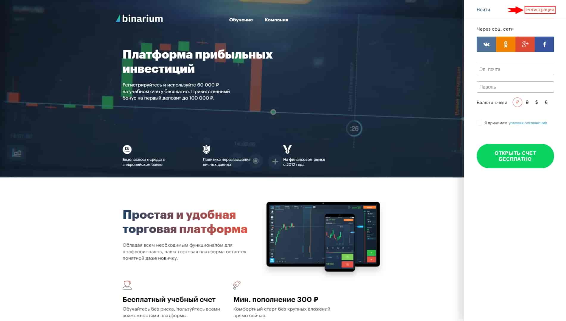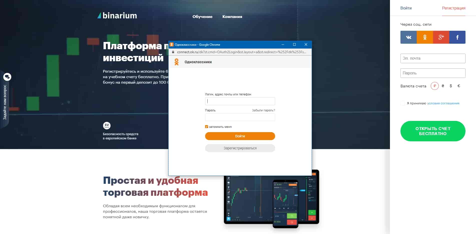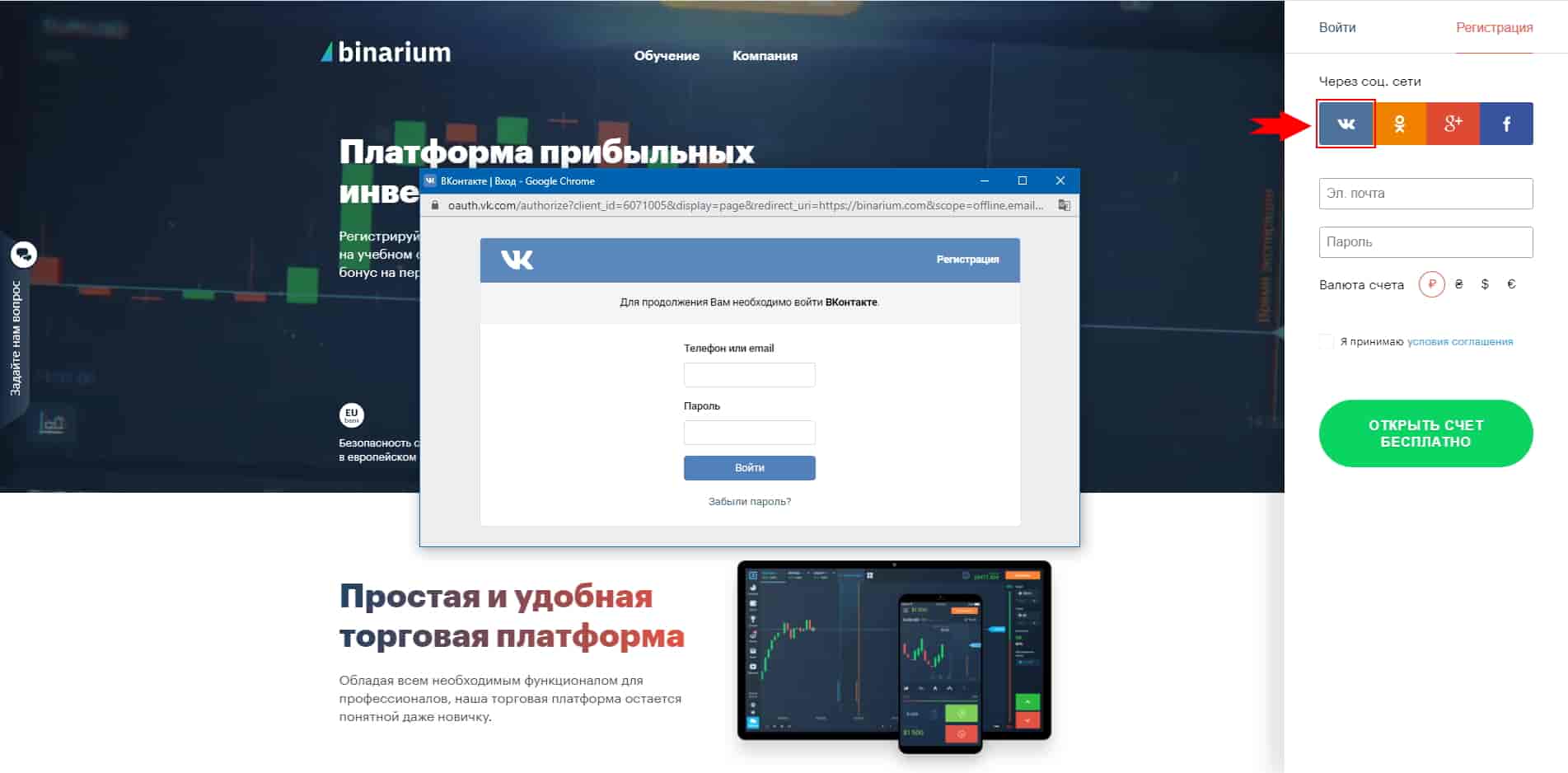 On the Binarium platform, registration can be accelerated by using an account on one of four social networks: