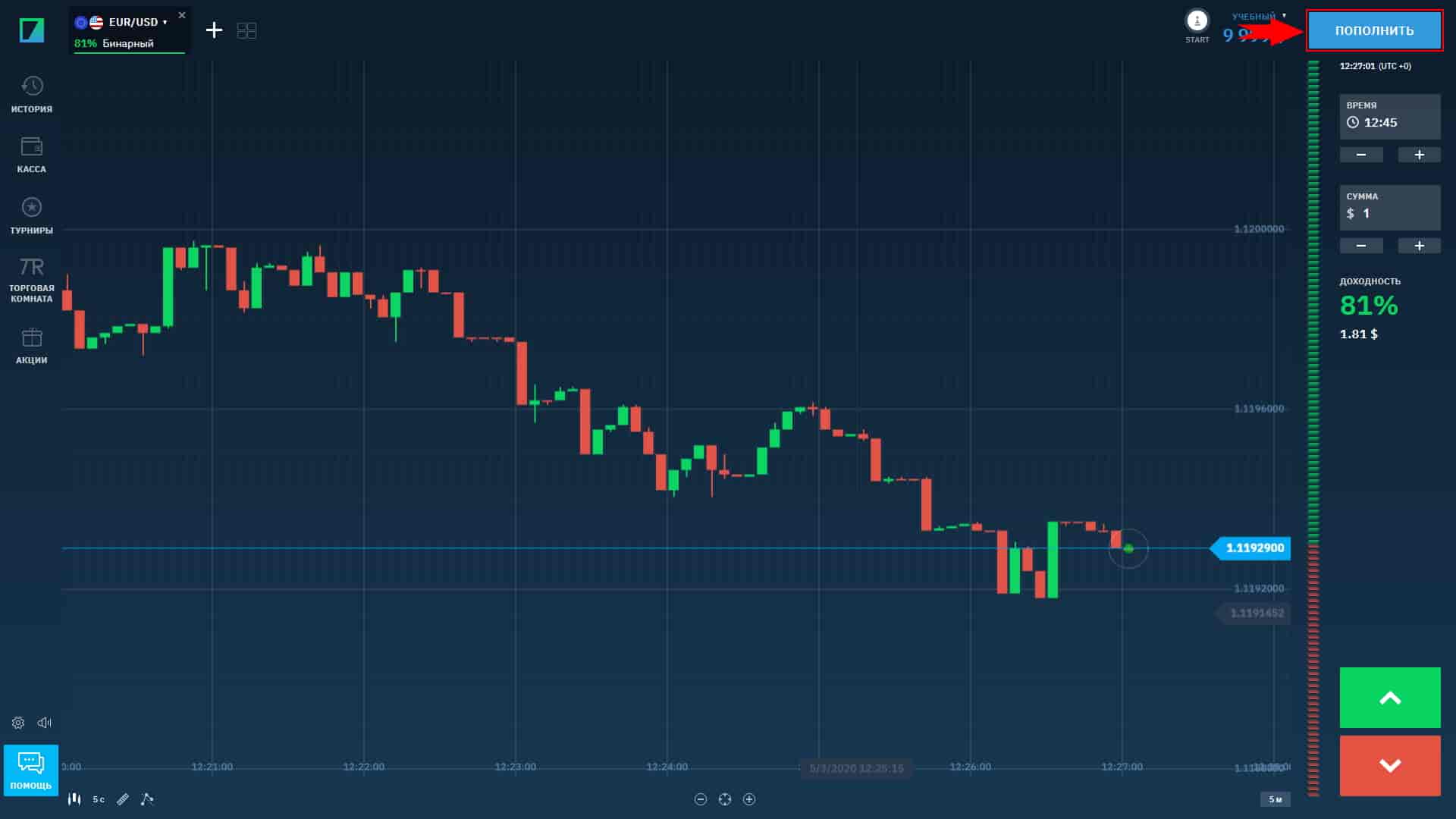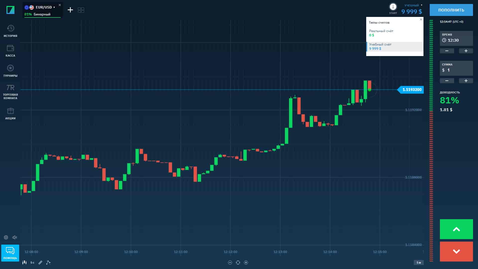To start trading binary options, just click on the button of the same name. After this, a trading platform will open with two types of accounts, switching between them in one click.