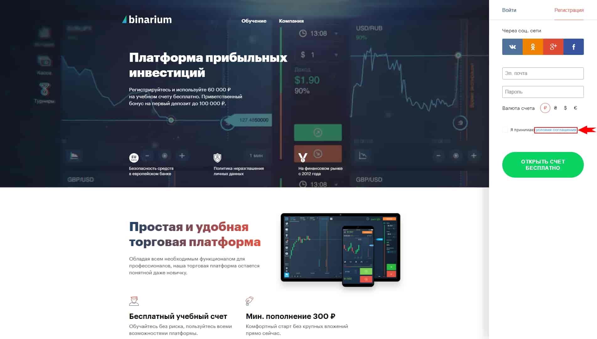 If you have questions related to both Binarium registration and the terms of cooperation, it is recommended that you read the user agreement. To get this information, you need to click on the link of the same name located at the bottom of the screen: