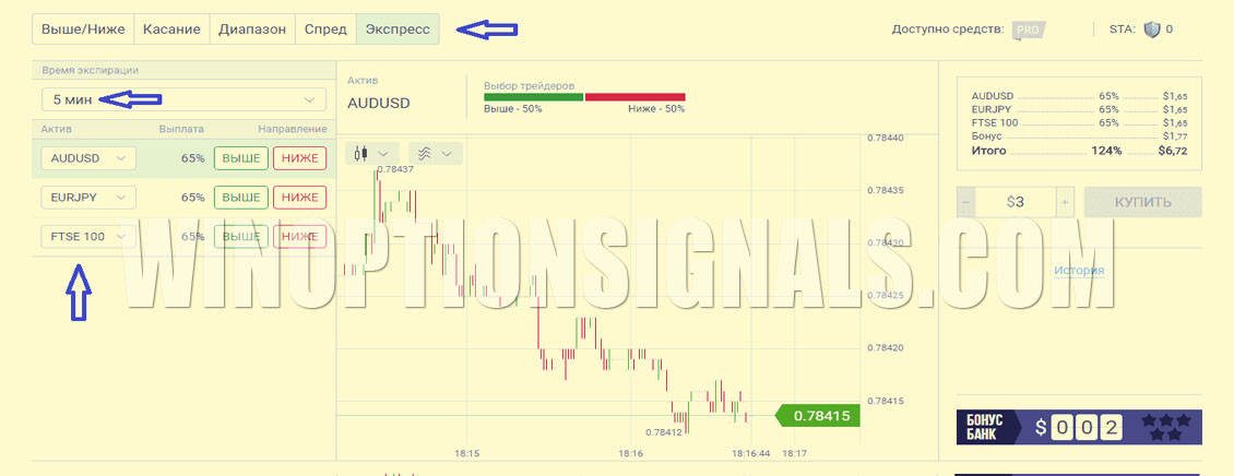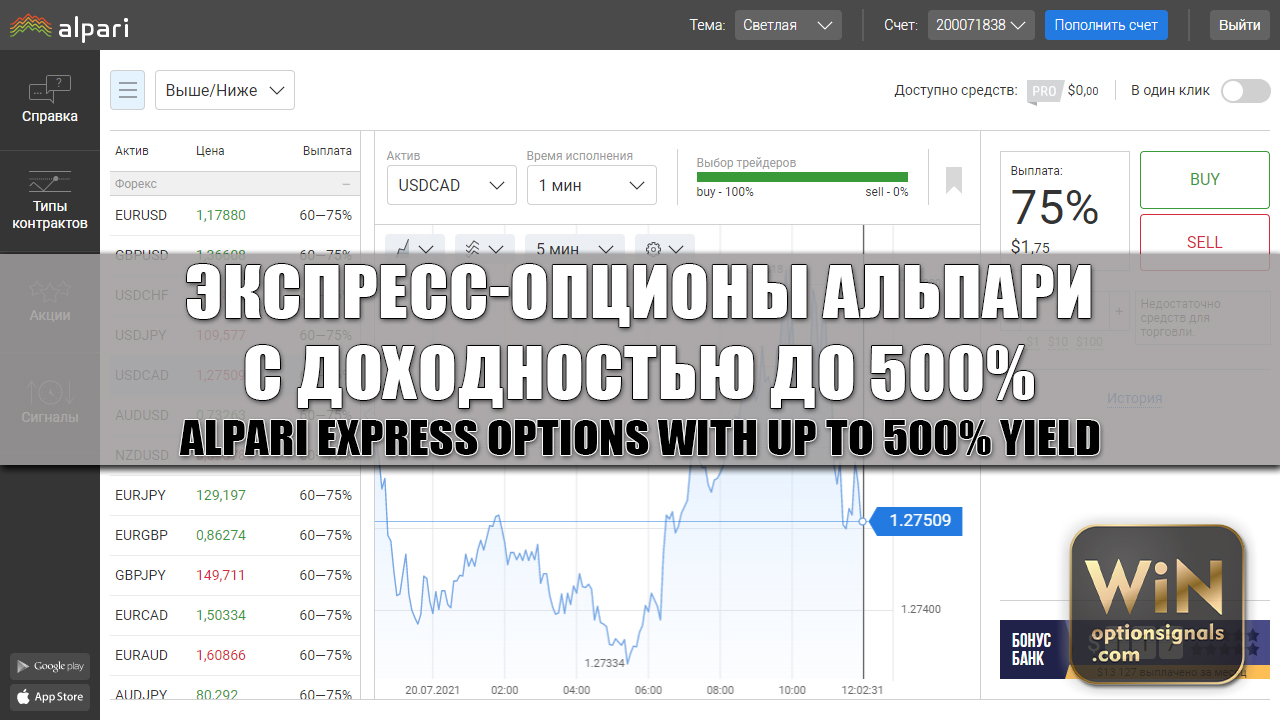 Express options from the Alpari broker allow you to buy options on three trading assets at once, and for each asset you can specify the expected price direction. This type of options is the highest risk, since in order to make a profit, all three assets must be winning, and as you know, it is difficult to predict the movement for such a number of assets. At the same time, the profitability of such options pays off and can be up to 300%: