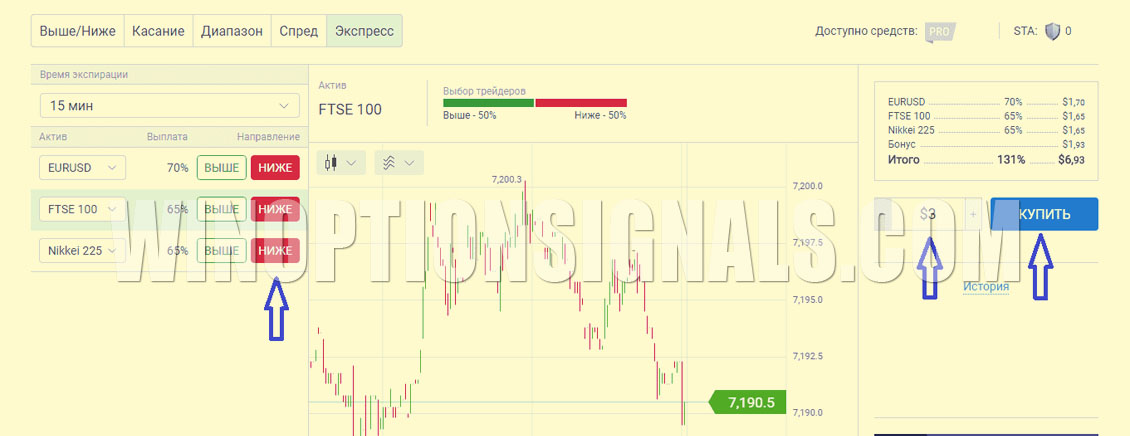 The new product from Alpari does not change the essence of binary options. The basis of trading remains the same: identifying a trend and making a decision about the choices offered by the “Above” and “Below” buttons. In the case of Express, the difference can be traced in one thing - for the forecast, not 1 trading asset is used, but 3, which is done simultaneously. From a practical point of view it looks like this: