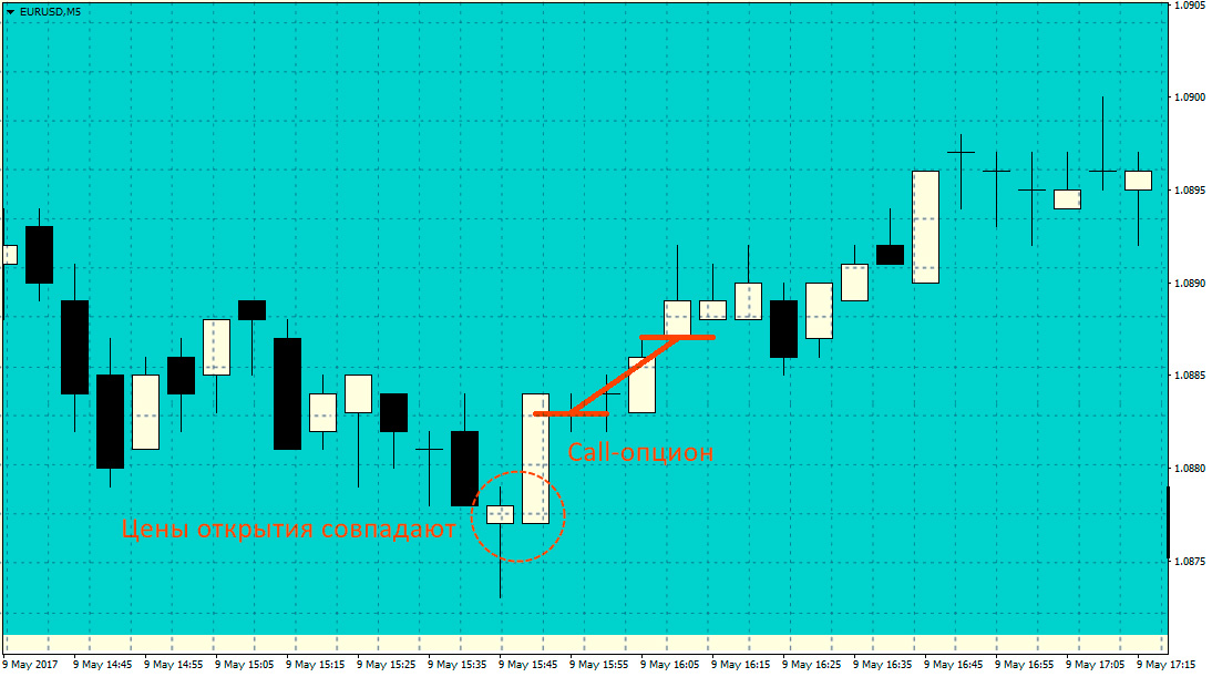 The first thing a trader should do is to find a candlestick on the chart with a small body and a relatively large shadow. Dojis as well as pin bars also fall under this category. The next candle formed should have a large body, with which it will overlap the short body of the bar located in front of it. The chart may show equality in opening prices, which is a fairly strong signal for a reversal. At the opening of the third candle, an option is purchased.