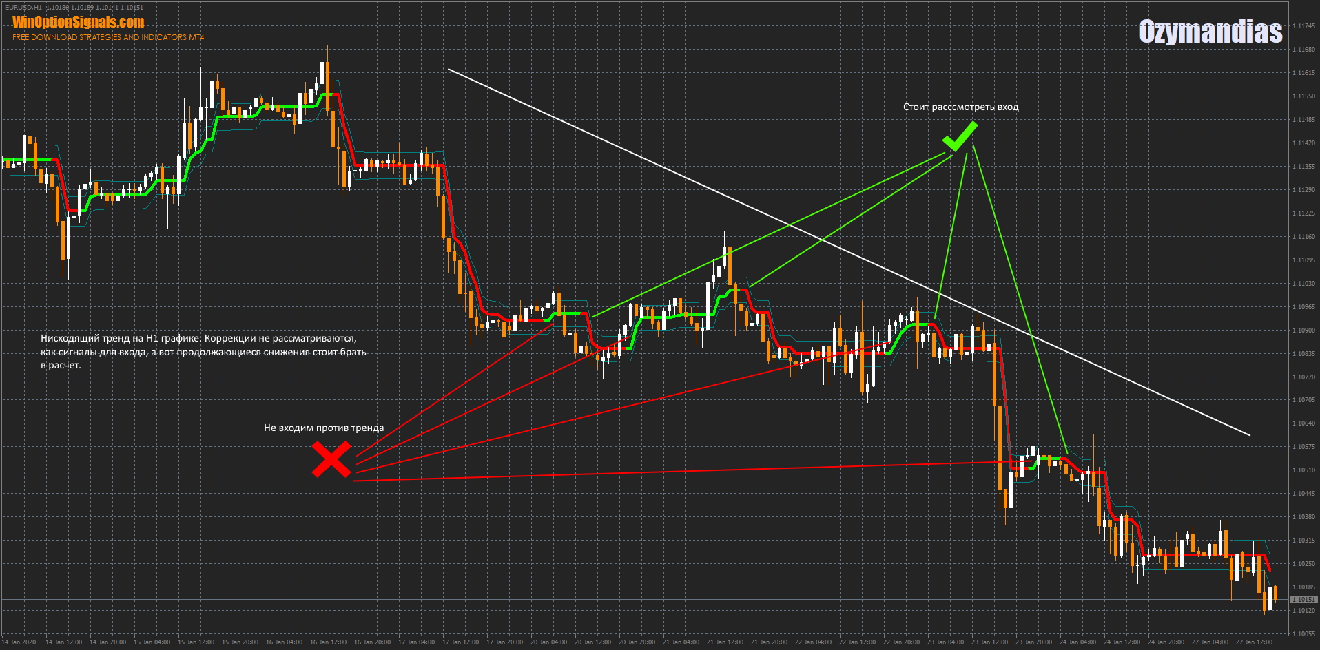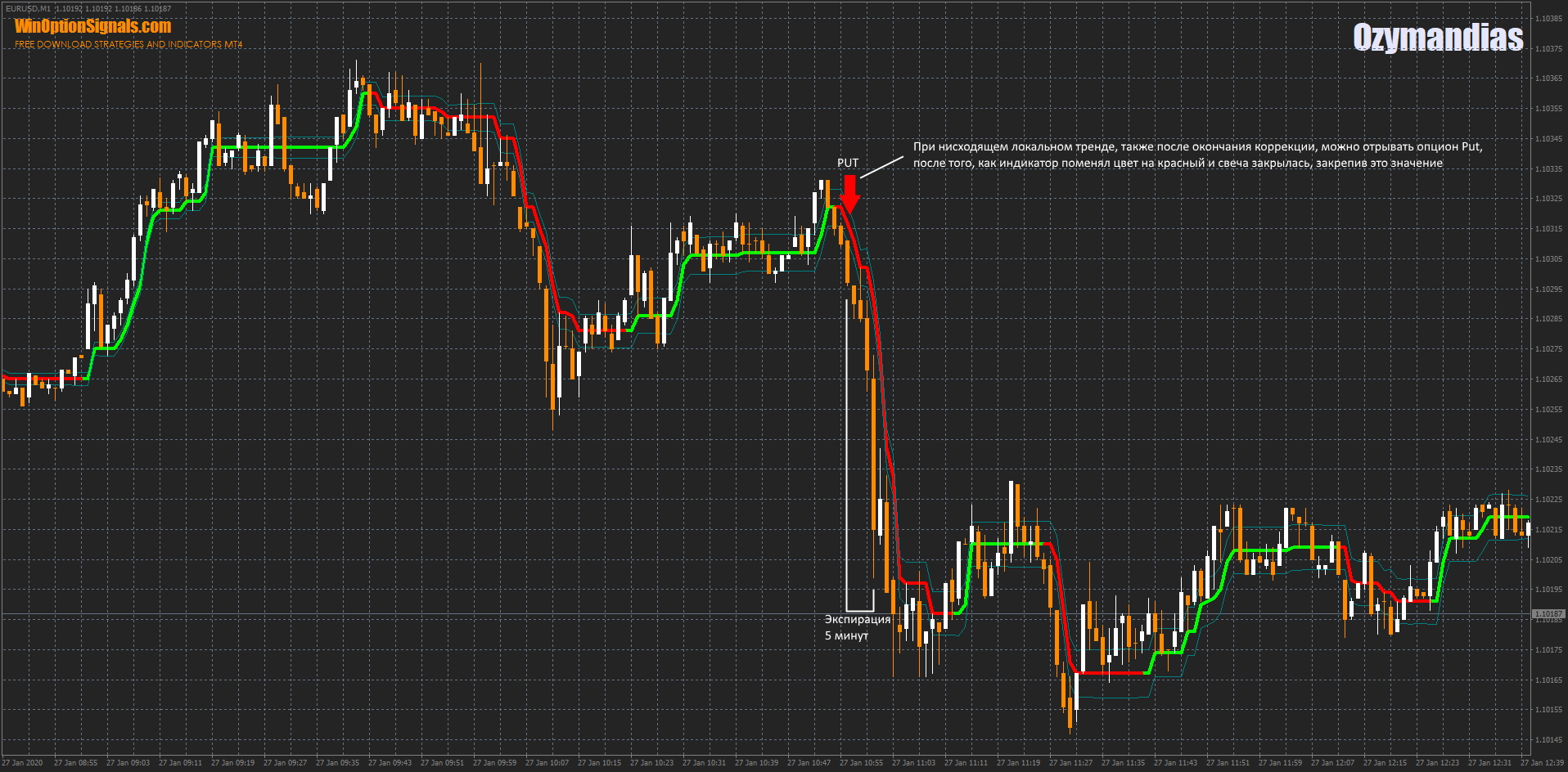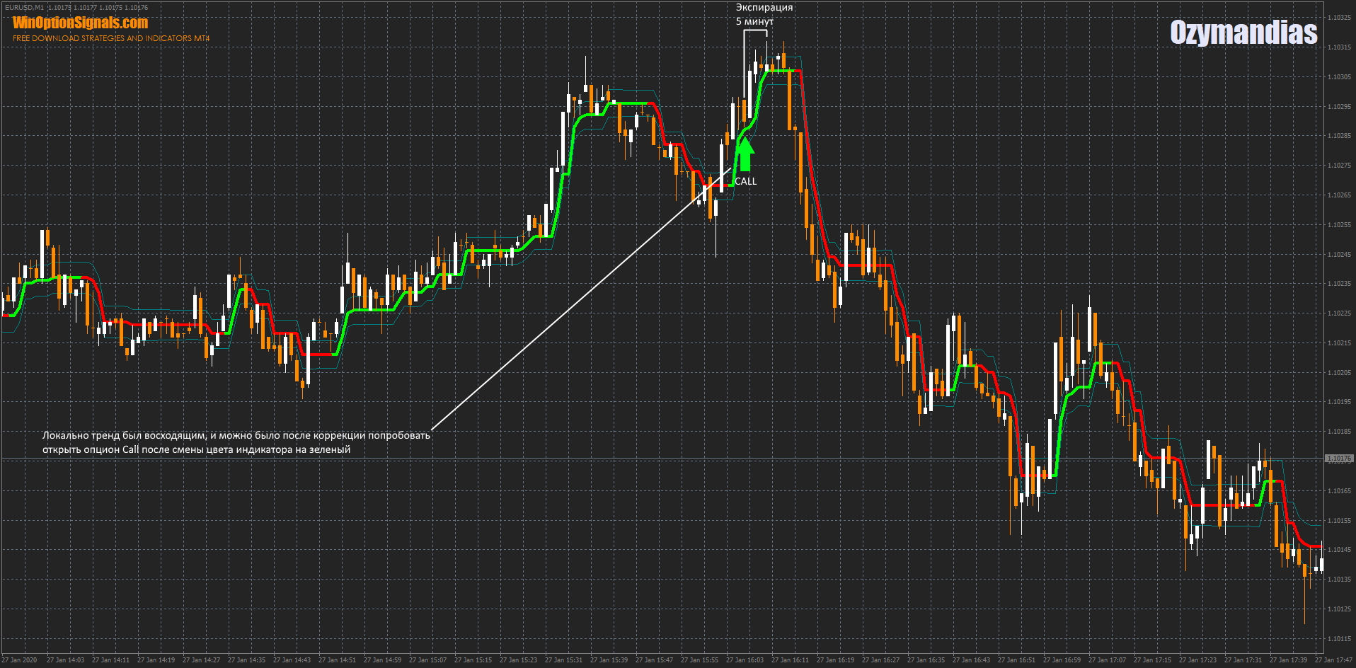 The indicator for binary options Ozymandias is a trend indicator, and as practice shows, it copes with its task perfectly. This is most likely why this indicator for binary options is used in many trading strategies. In addition, the Ozymandias indicator filters market noise, ignoring high intraday volatility, which reduces risk and does not provide unnecessary signals for entering the market.