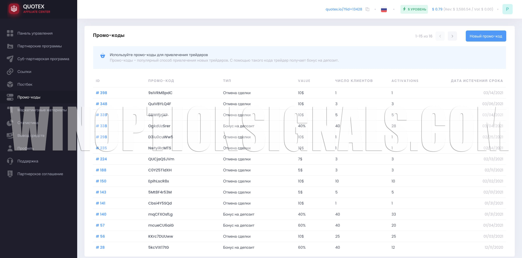 In addition, a high level of affiliate account guarantees that you will receive profitable promotional codes from the Quotex broker to replenish your clients’ accounts, as well as bonus promotional codes for canceling unprofitable transactions. The table with promotional codes looks like this: