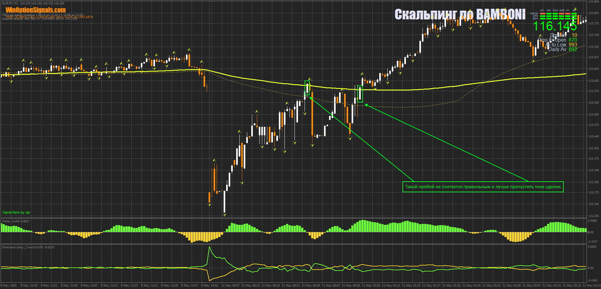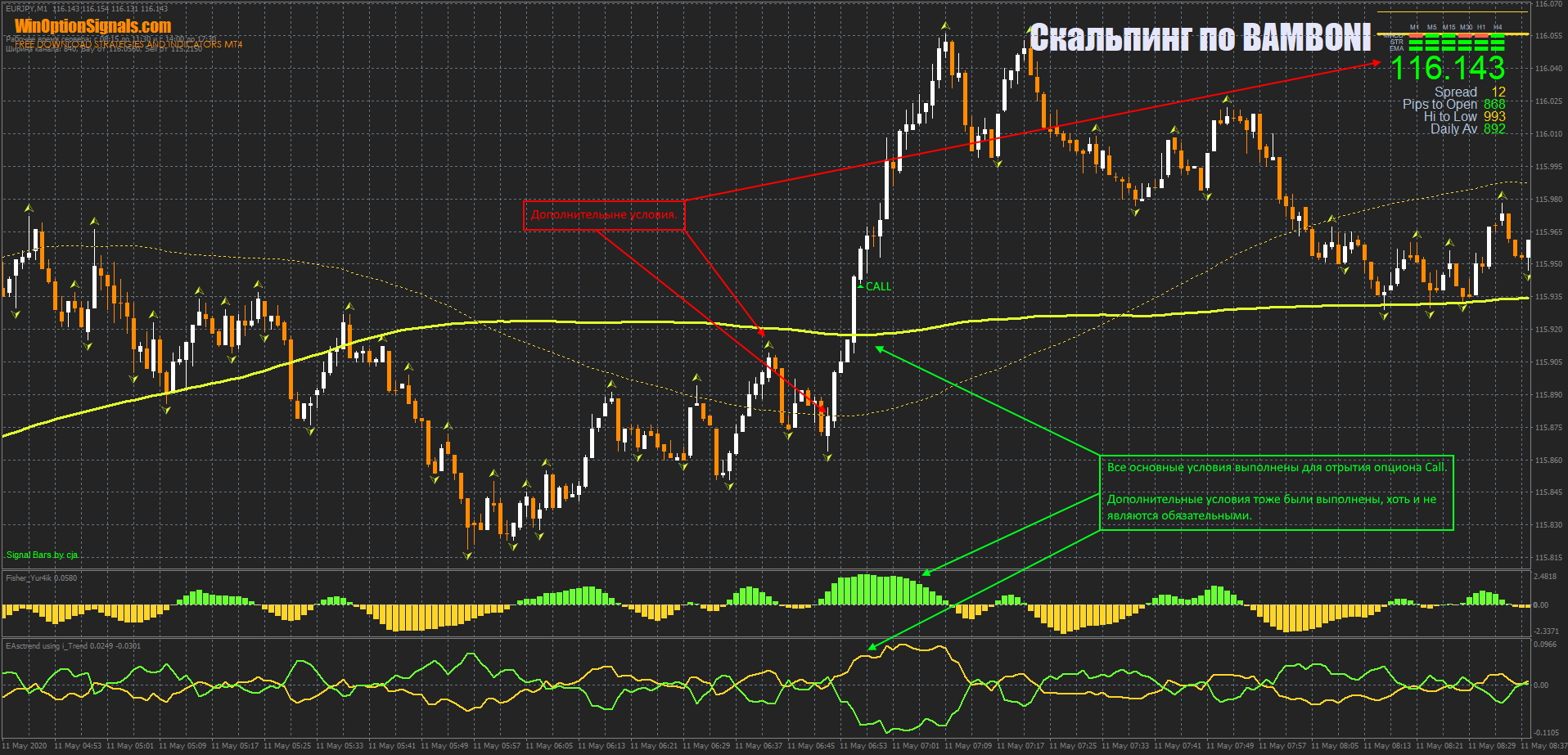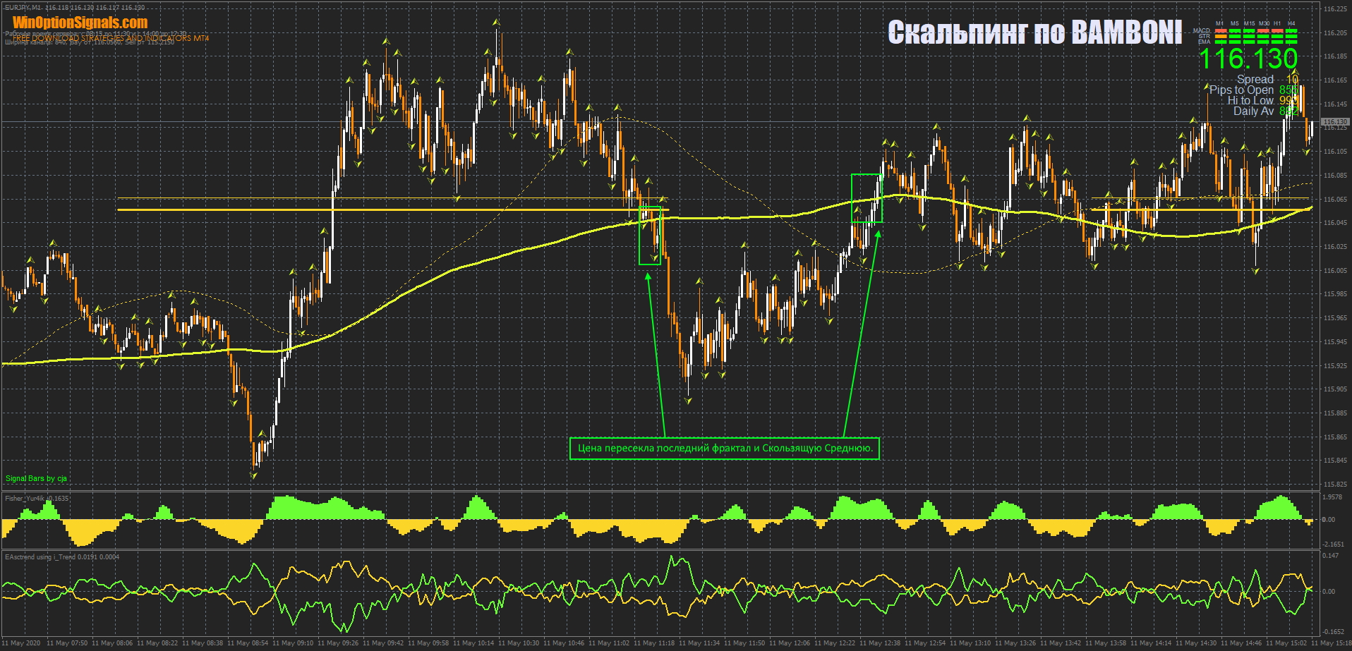 The strategy for binary options and Forex “Scalping by BAMBONI” is based on both standard effective trend indicators and proprietary trend and flat indicators, which in the “mix” makes it possible to trade both binary options using this strategy and on the Forex market.