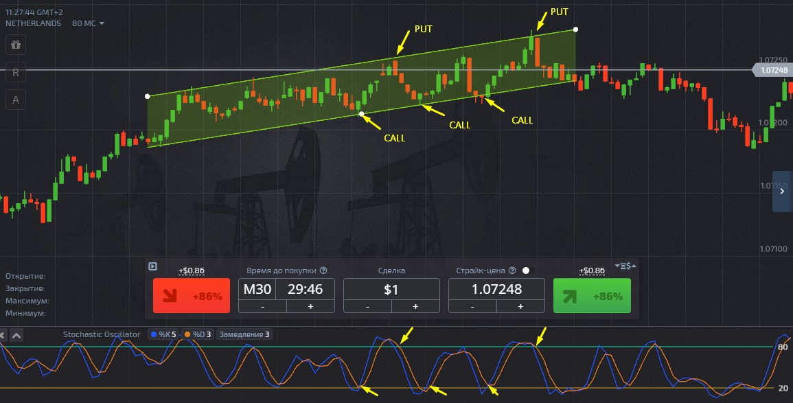 The principle of trading with scalping comes down to two rules. As soon as the price reaches the lower line of the corridor and the Stochastic chart has left the oversold zone, you need to buy a CALL option. It is necessary to place an order to purchase a PUT option if the opposite situation occurs. That is, such transactions are concluded if the price bounces down from the upper limit and the oscillator line leaves the overbought zone.