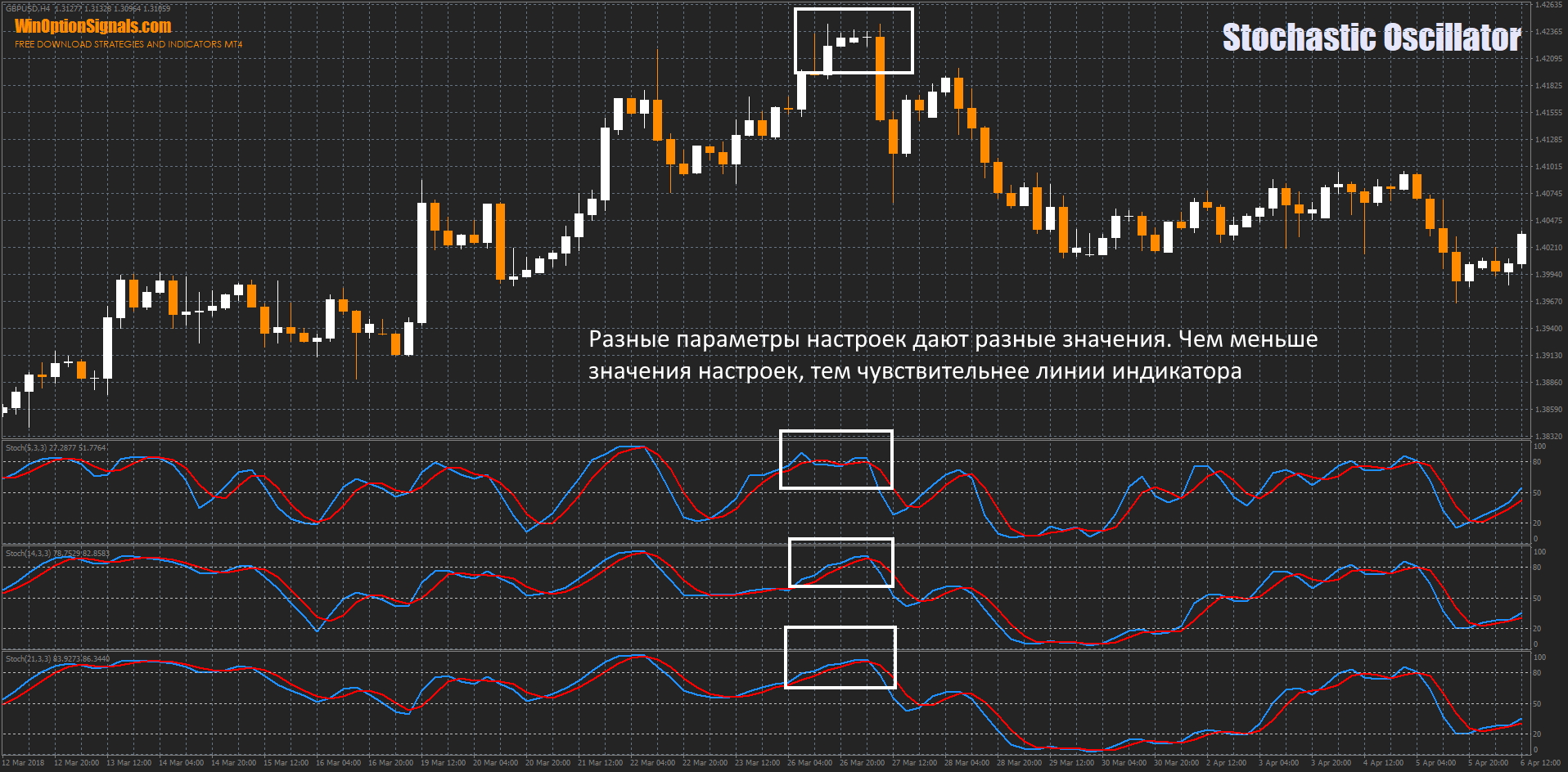 The creator of the indicator based his assumptions on the fact that if there is a strong upward price movement (upward trend), the closing price of the selected time frame will be in the zone of the previous maximum price. When moving down (downward trend), the price will, on the contrary, be close to the previous minimum value. Stochastic consists of a number of algorithms to filter out “price noise”, which adds accuracy to its readings.