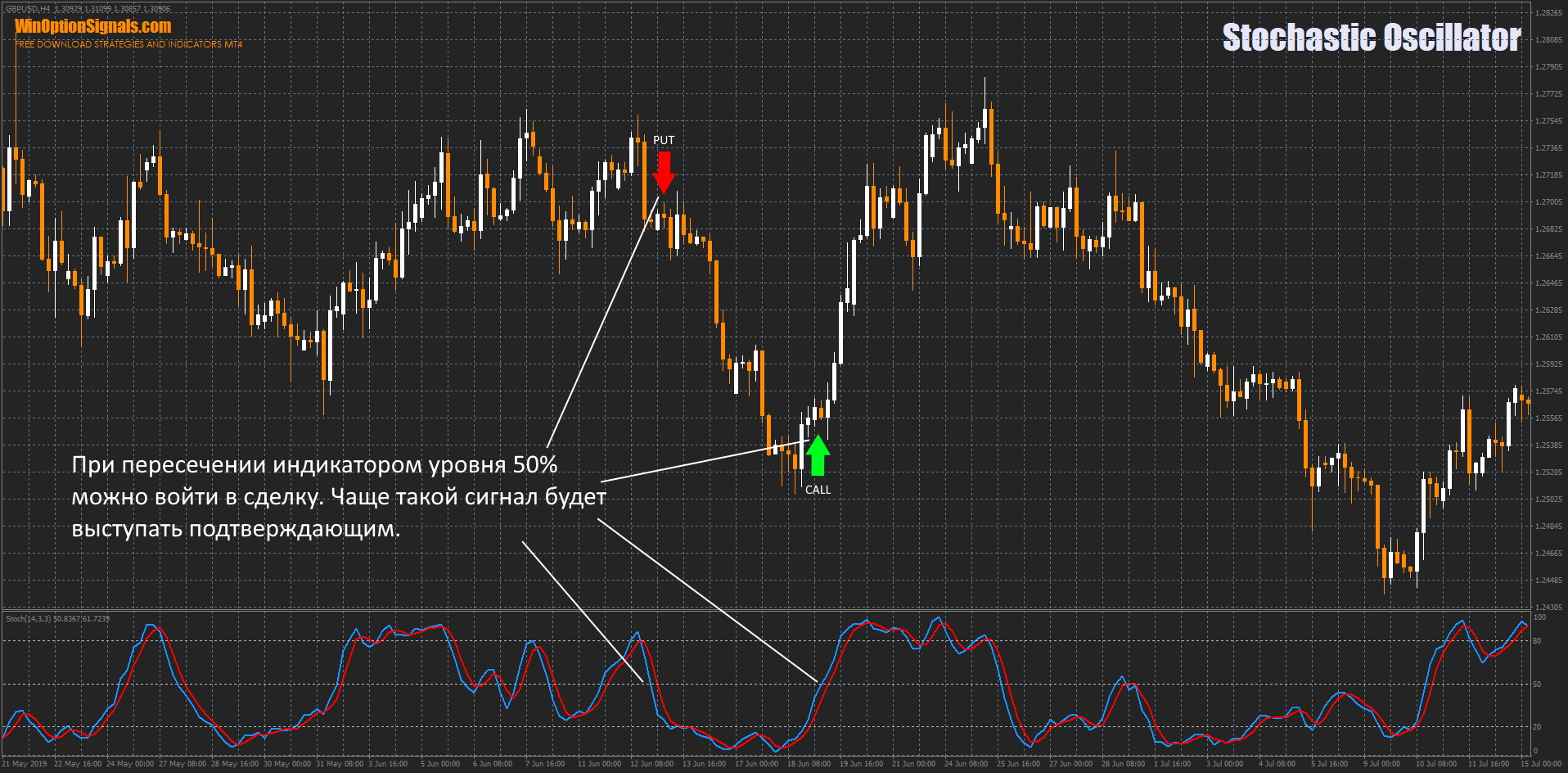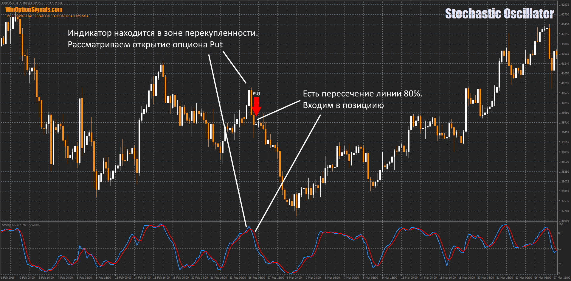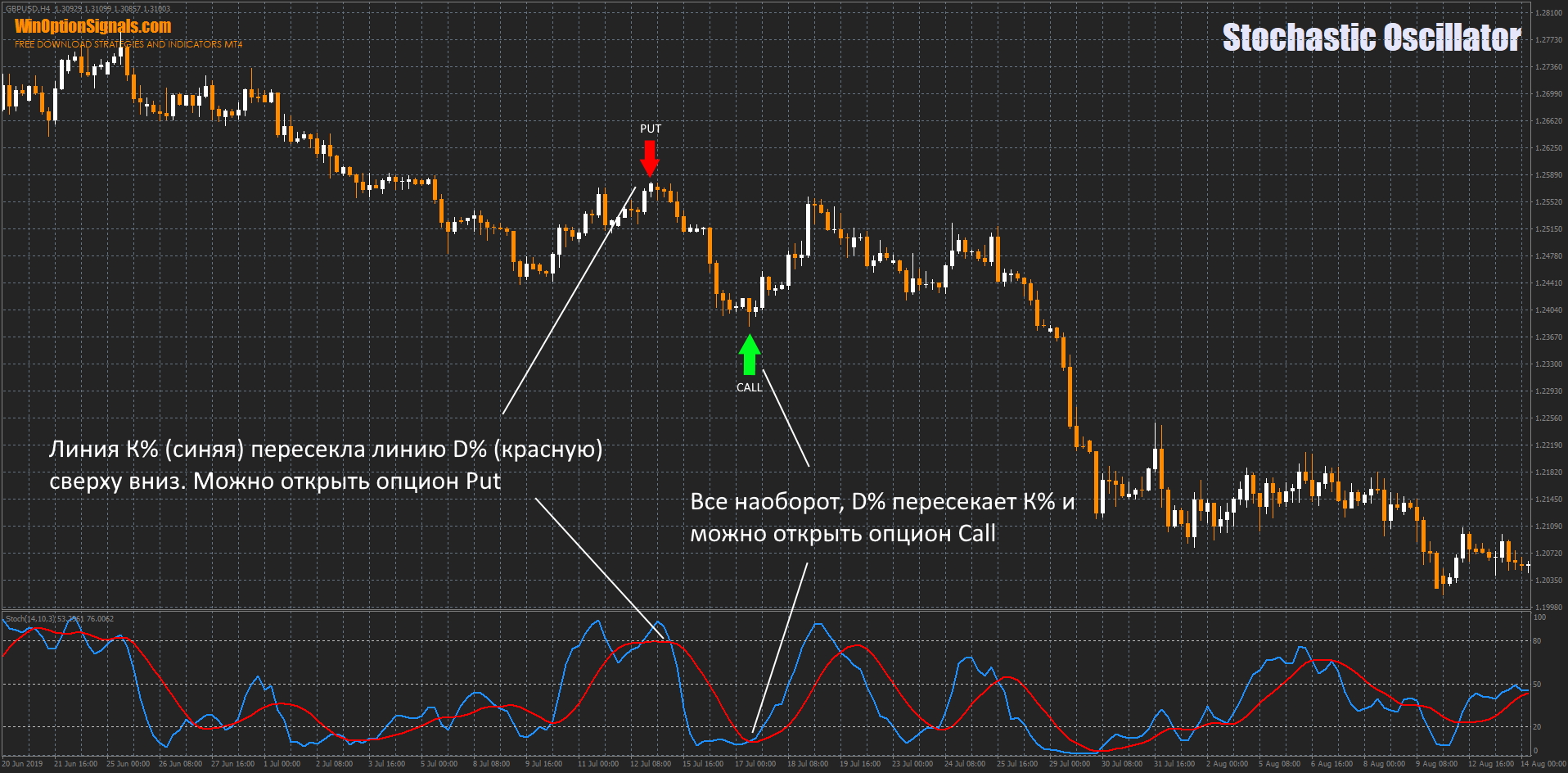 - A downward reversal of the indicator at an overbought level of 70-80% is considered a signal to open a Put option. When the %D line crosses the 70-80% line from top to bottom, we receive additional confirmation of the signal.