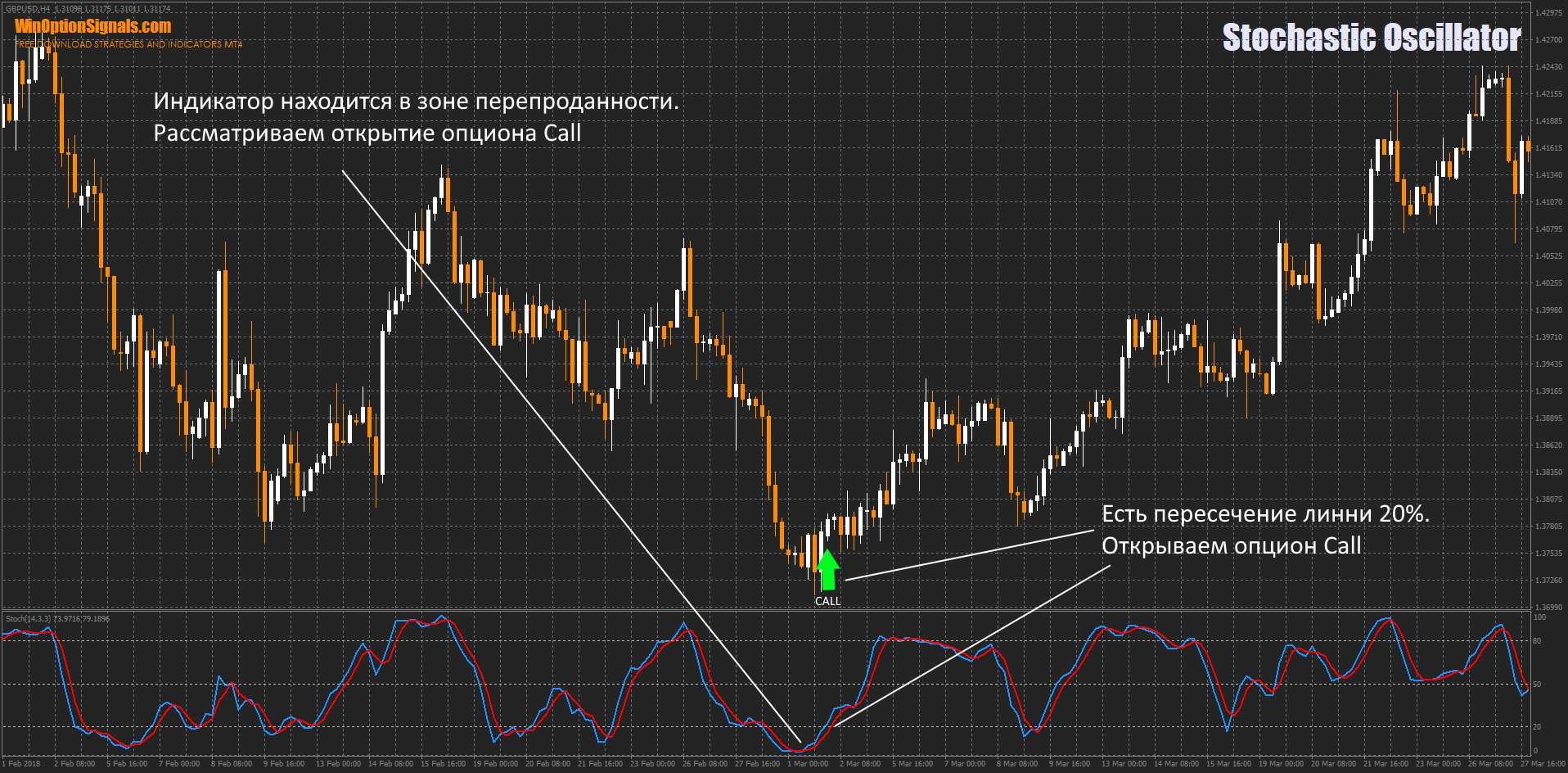 - An upward reversal of the indicator at an oversold level of 20-30% is considered a signal to open a Call option. When the %D line crosses the 20-30% line from bottom to top, we receive additional confirmation of the signal.