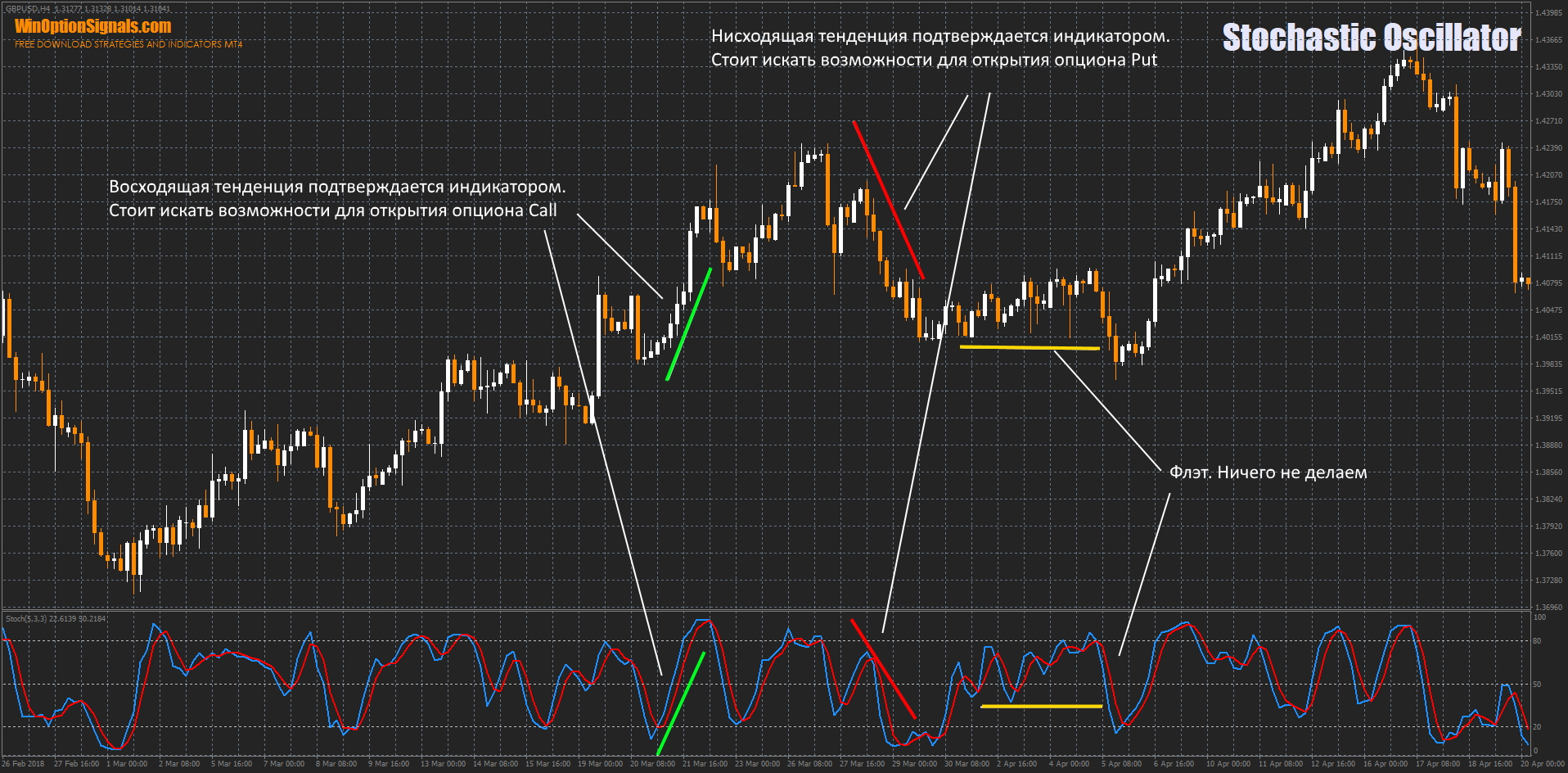 Stochastic can also be used for trading divergences. The meaning of divergences is the same everywhere and to understand how to use them, it is worth reading the article about the MACD divergence indicator and the Kwan NRP indicator for binary options . These articles provide complete information on the use of divergences on any indicators that show them.