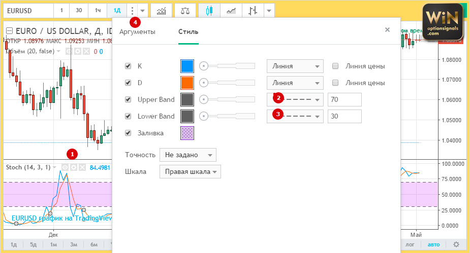 To trade Stochastic, you can use any chart timeframe . However, for binary options the M1 scale is most suitable. It is convenient to trade options with short expiration dates on such a TF. It is beneficial to use this indicator on those trading instruments that have high volatility and also have a pronounced general trend.