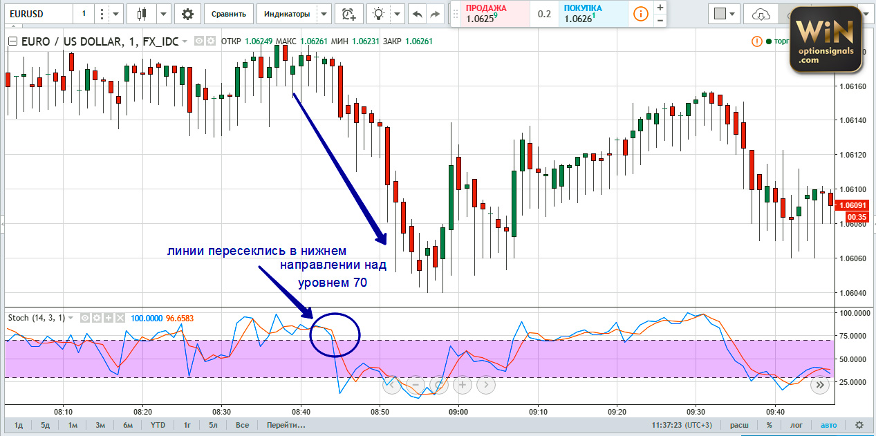 - We monitor the behavior of the oscillator lines and wait for the moment when they enter the overbought zone above 70 as a result of a local correction.