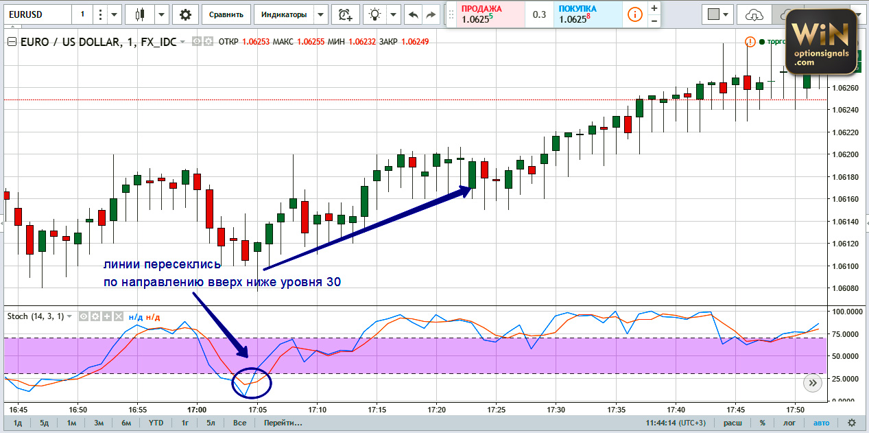- We wait until, as a result of a local correction, the indicator lines go below level 30, demonstrating that the asset is oversold, and then turn upward and intersect.