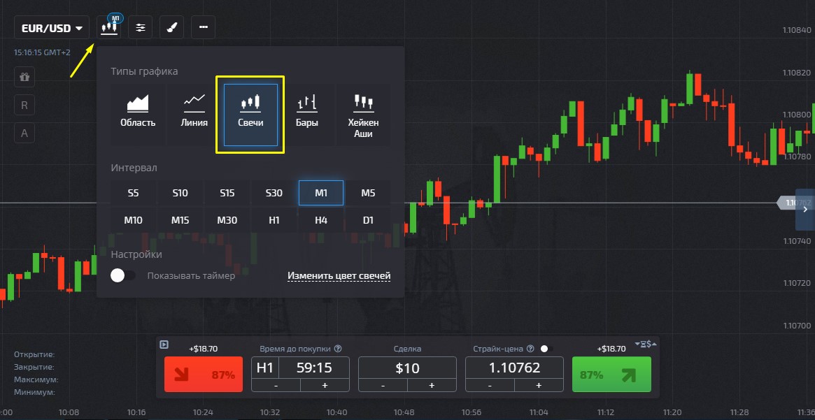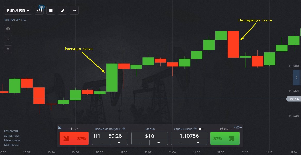 Rectangles (or candles) are constantly forming on this chart. Their “body” is the distance between the opening and closing prices. In the Pocket Option broker terminal, candles that are formed during a downtrend (when the opening price is higher than the closing price) are colored red. In an uptrend (the closing price is higher than the opening price), green rectangles appear.