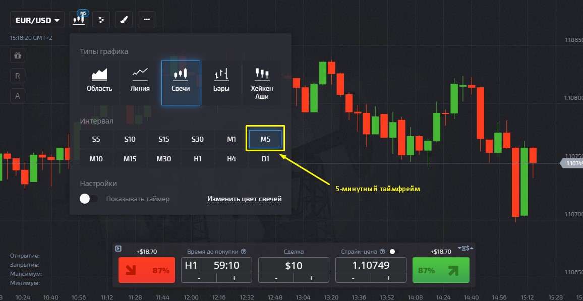 Transactions to purchase Put options are made in the opposite situation. That is, such orders are placed at the moment when the next red candle falls below the low of the previous one.