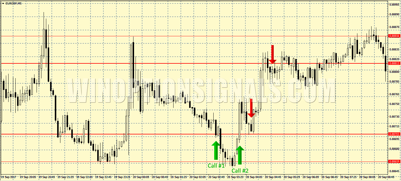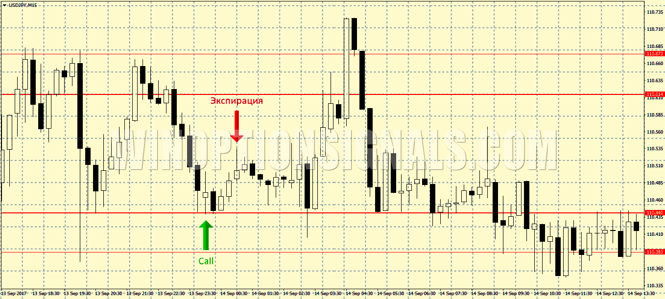 You need to buy an option when the price touches the channel border and the candle closes above it. For TF M15, the expiration period in the example under consideration will be 1 hour. Touching it again is a signal to open another trade. The PUT option is purchased when the upper level is touched.