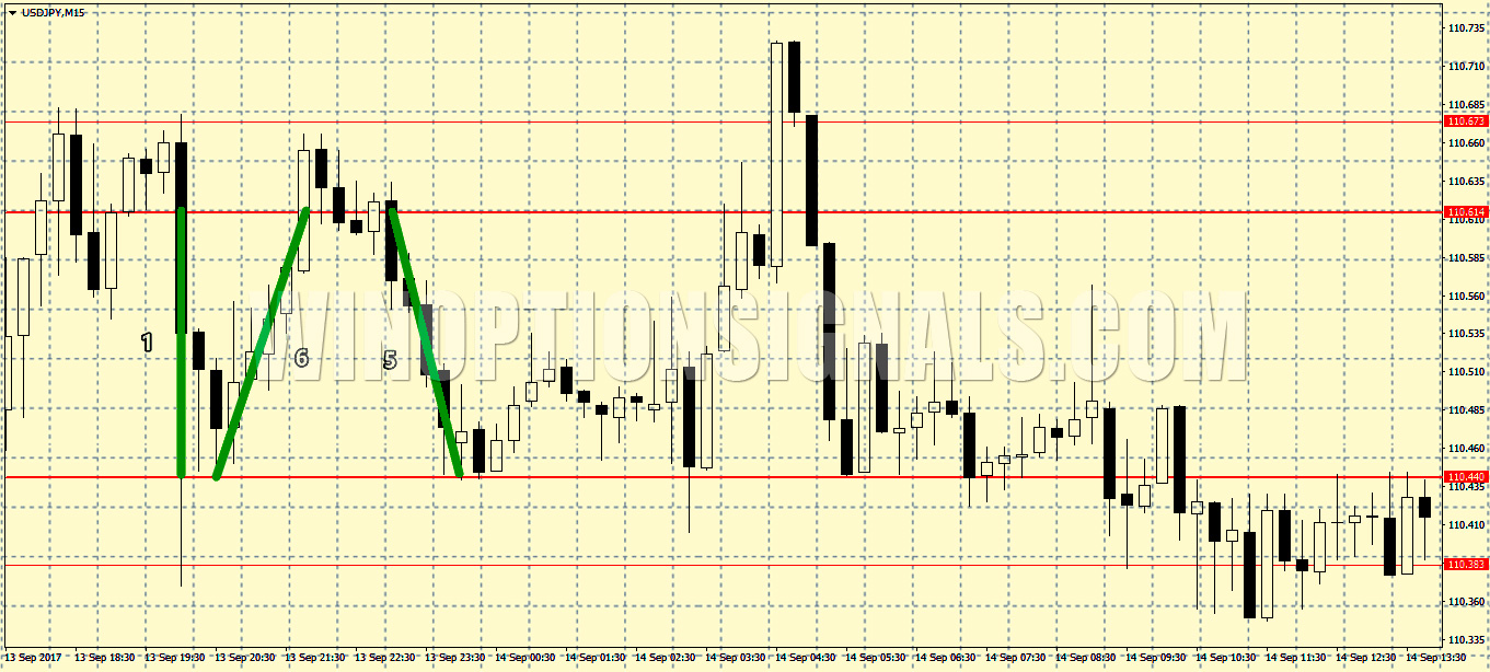 The advantage of BO is that the price of the asset should be only slightly higher at the end of expiration than at the time the transaction was opened. Since the average value of the channel is used, the probability of making a profit on both options will be quite high. As another example, consider the M15 chart of the USDJPY currency pair. This channel is a night channel, so the price fluctuation is not that big. The average number of candles is 4. This value is obtained based on the addition of the three previous waves.