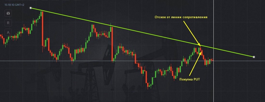 Orders for Put options must be placed in the opposite situation. Transactions in this case are opened if, during a downward trend, the price chart bounces off the resistance line and continues to move down.