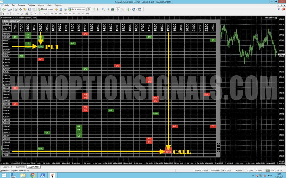 In the indicator table you can see assets for which there is a high probability of a change in movement. You should choose those with the highest value (from 10), and if the cell is green, then you should buy a Put option, and if it’s red, you should buy a Call. Also in the table you can immediately see the time and name of the asset, which is very convenient. You specify the timeframe and period for which the analysis is carried out yourself: