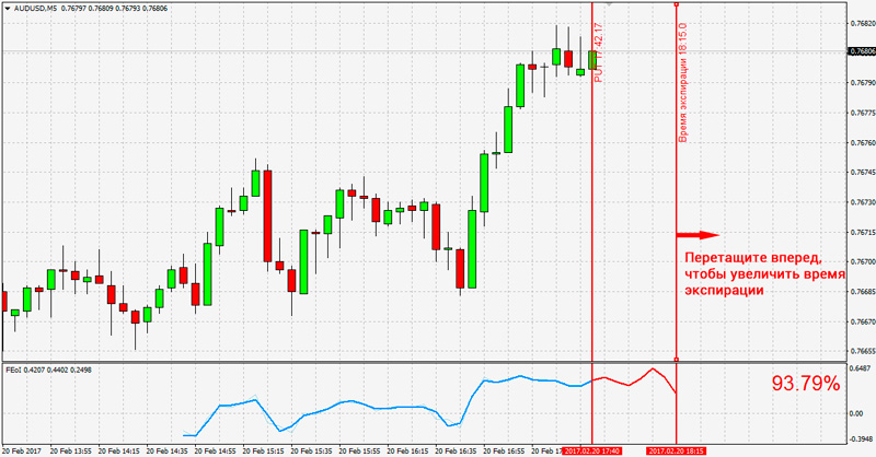 ExpirationTime — option expiration time in bars. It can be adjusted by dragging the mouse line directly on the chart. For more flexible settings, it is recommended to use a timeframe one step lower than the set period. Increasing the forward forces the program to analyze a larger array of data.