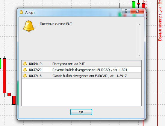 - gives a double signal: using the alert built into MT4, as well as changing the color on the chart.