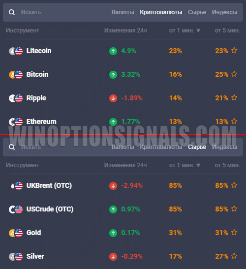 | Currency pairs in binary options | Indexes in binary options | Commodities and cryptocurrencies in binary options |