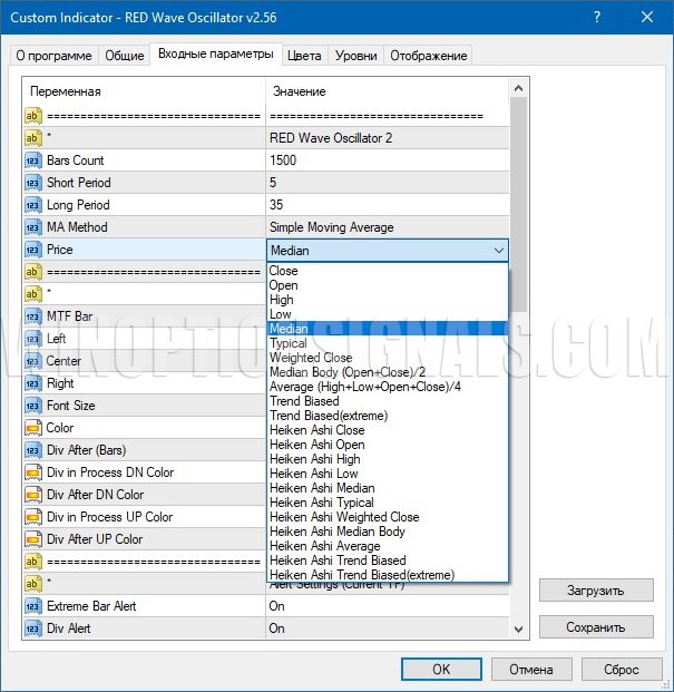 Как можно видеть из изображений выше, выбрать можно как метод построения MA для индикатора RED Wave Oscillator, так и тип цены, которая будет использоваться для построения.