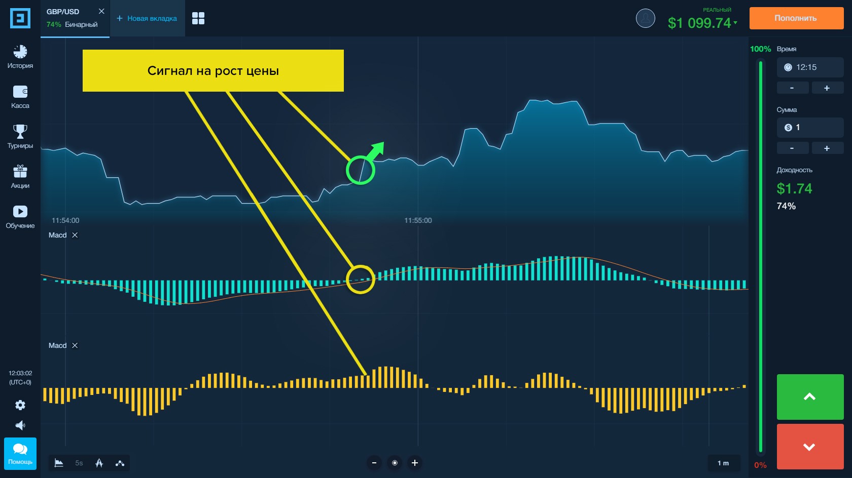 Индикатор MACD сочетается с себе импульс и тренд. График данного инструмента всегда следует в том же направлении, что и текущая тенденция. В связи с этим, научившись применять эту стратегию для Бинариум, трейдер сможет с высокой частотой извлекать прибыль из торговли активами.